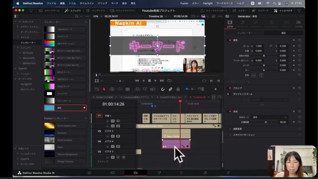 上の映像のところを見てみると、テキストに隠れてしまって字幕が見えませんね。そこで今回も前にやったように、「エフェクト」→「ジェネレーター」の順番でクリックして、メニューの中にある「単色」を選択しましょう。字幕の下に帯を敷く形にしたいので、「Neon Flicker」をビデオ4からビデオ5に移動させてください。そして単色を空きのできたビデオ4のところにドラッグして移動しましょう。