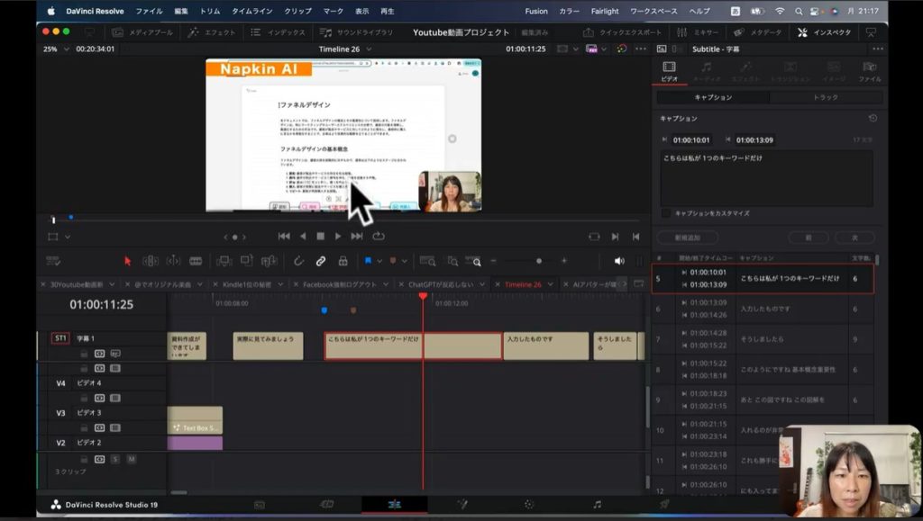 これまで紹介した動画を思い起こしてほしいのですが、このYouTube動画は私のワンショットとテキスト主体で解説する私の表情が右下にワイプで映っている場面があります。ワンショットで映っている映像であれば、字幕が邪魔することはありません。しかしテキスト主体の映像では、以下のスクショのようにワイプの私の表情と字幕がかぶってしまいます。