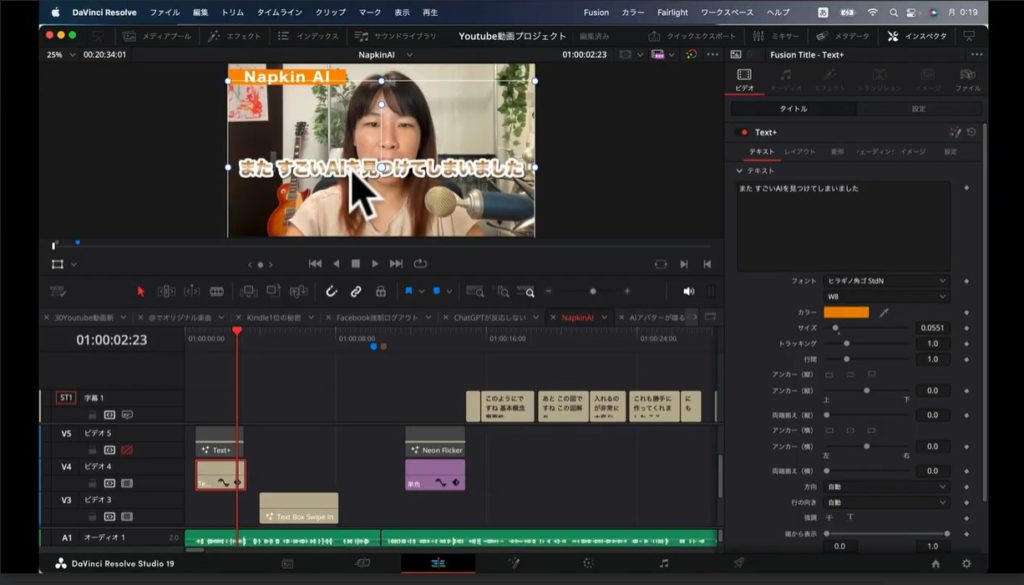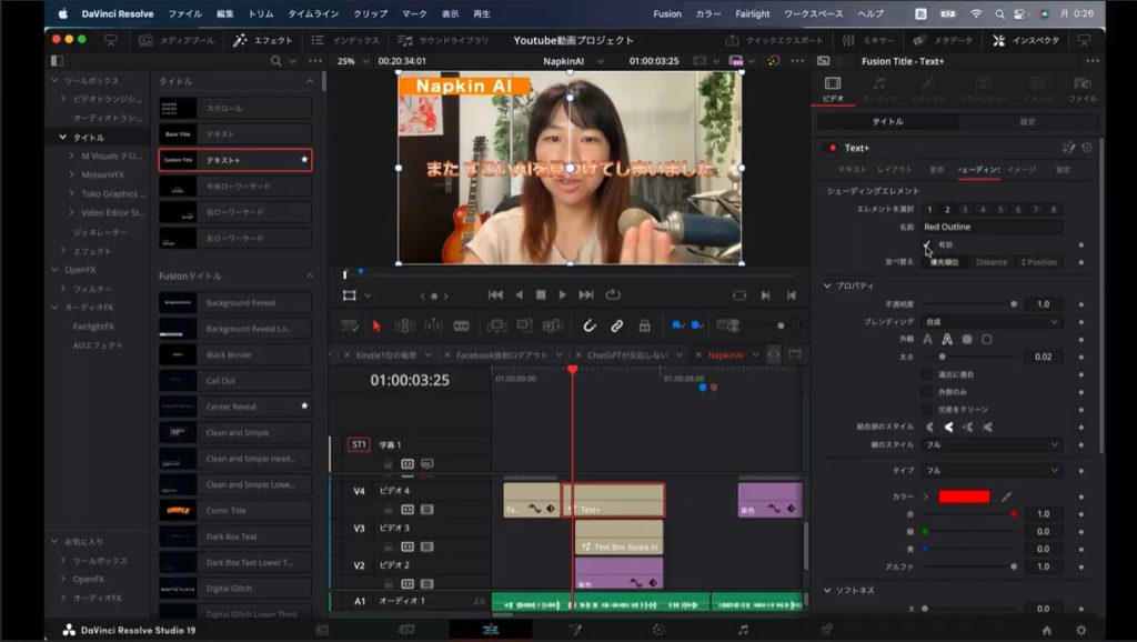 私の場合、「ビデオ4」というところにテキストを設置しました。テキストを設置できたところで、まずは文字を変えていきます。