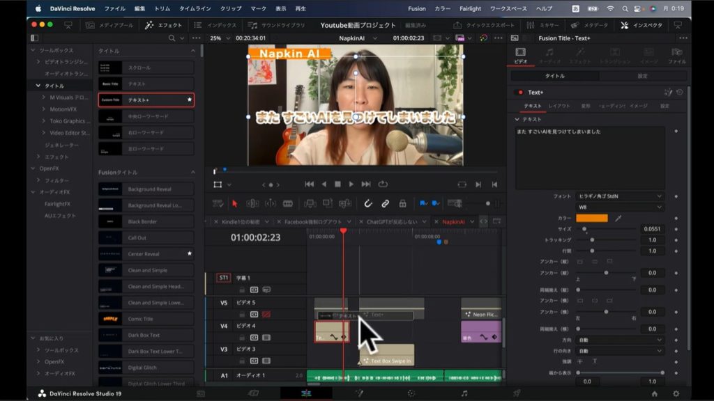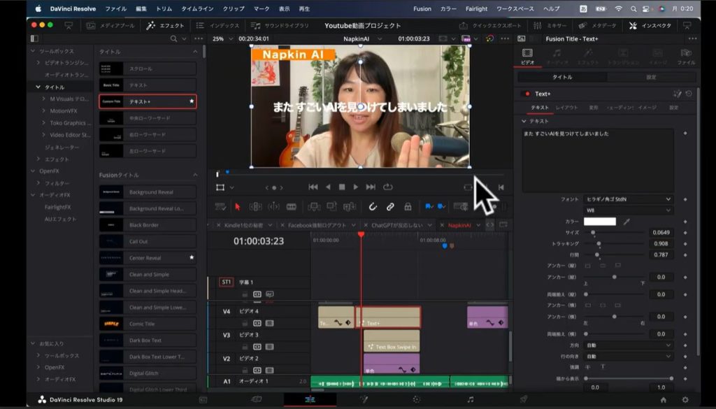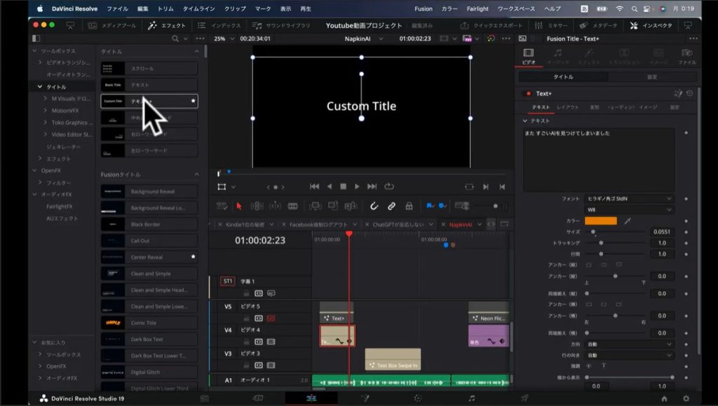 まずはDavinci Resolveの左上にある「エフェクト」タブをクリックしましょう。すると左側に「タイトル」というメニューが現れます。こちらを選択すると、右隣にタイトルのメニューがいろいろと出てくるので、以下のスクショのように「テキスト+」をクリックしてください。