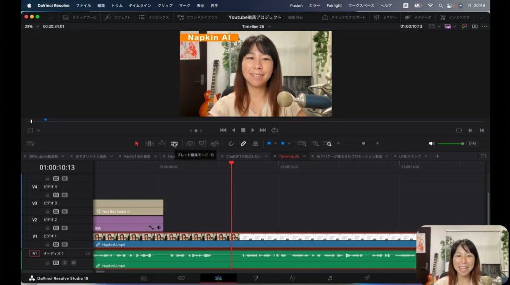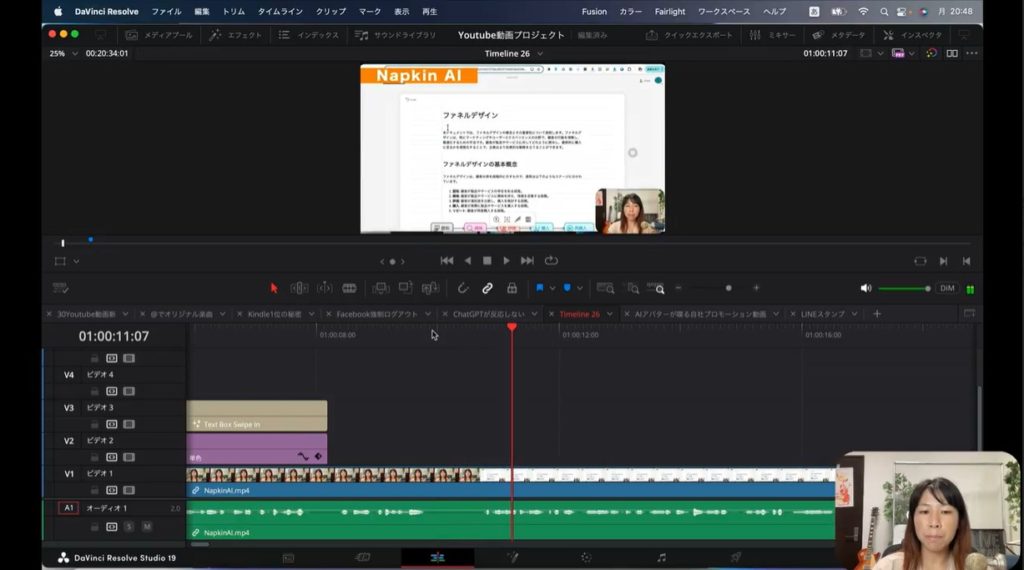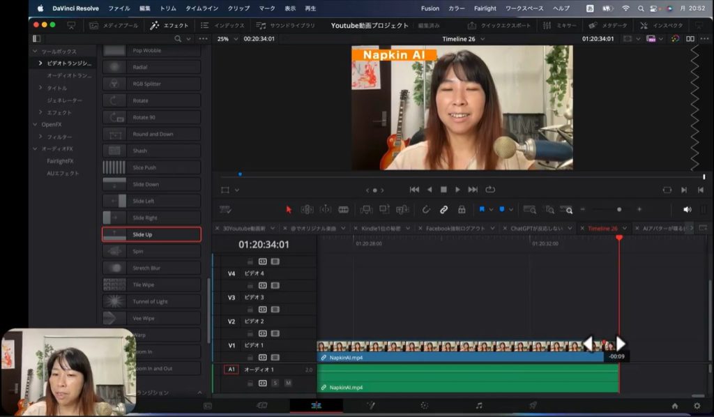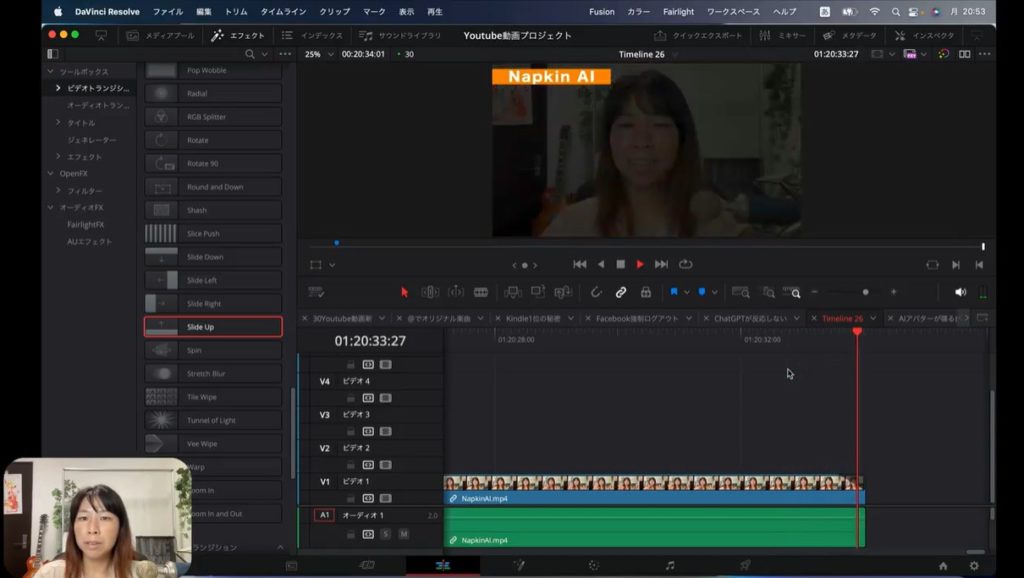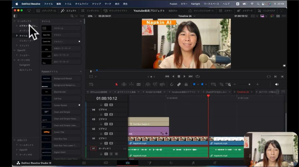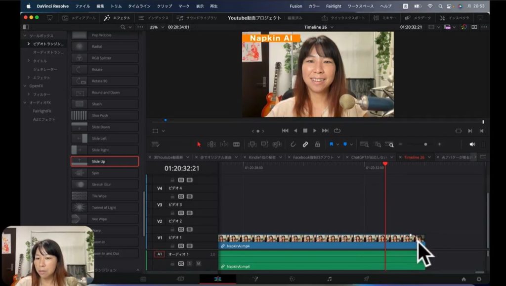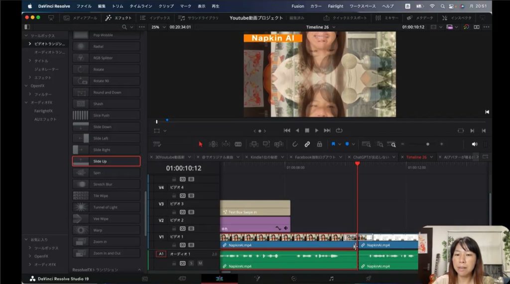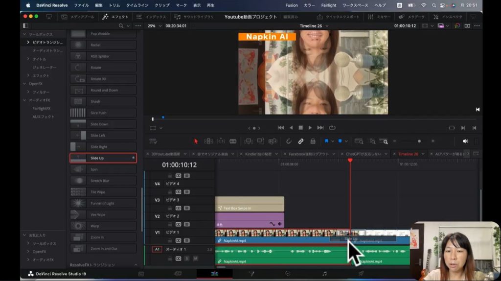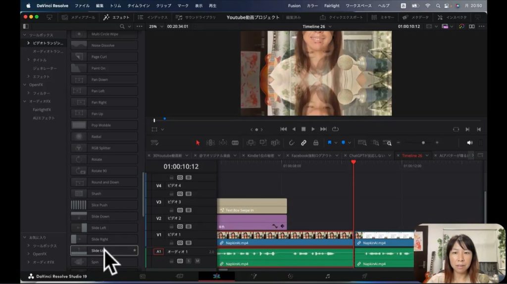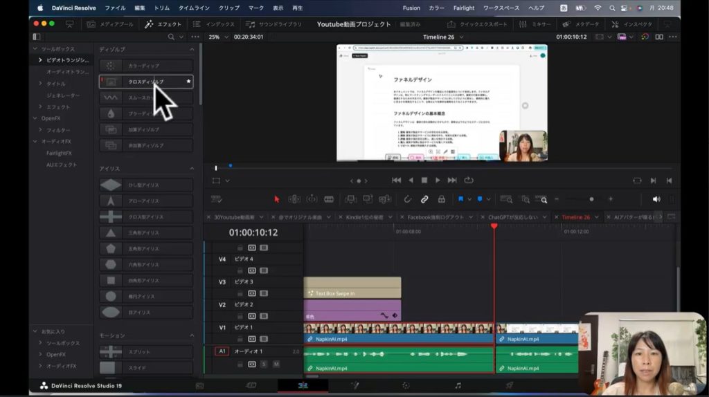 上の2枚の画像をご覧ください。実際に私が制作したYouTube動画です。まず私の顔が表示されて、そのあとで画面解説するために文字情報に切り替わるところがあります。そのままだと私の顔から急に文字情報に切り替わるので、ちょっと不自然ですよね。そこでトランジションを間に入れて、効果を加えていこうと思います。