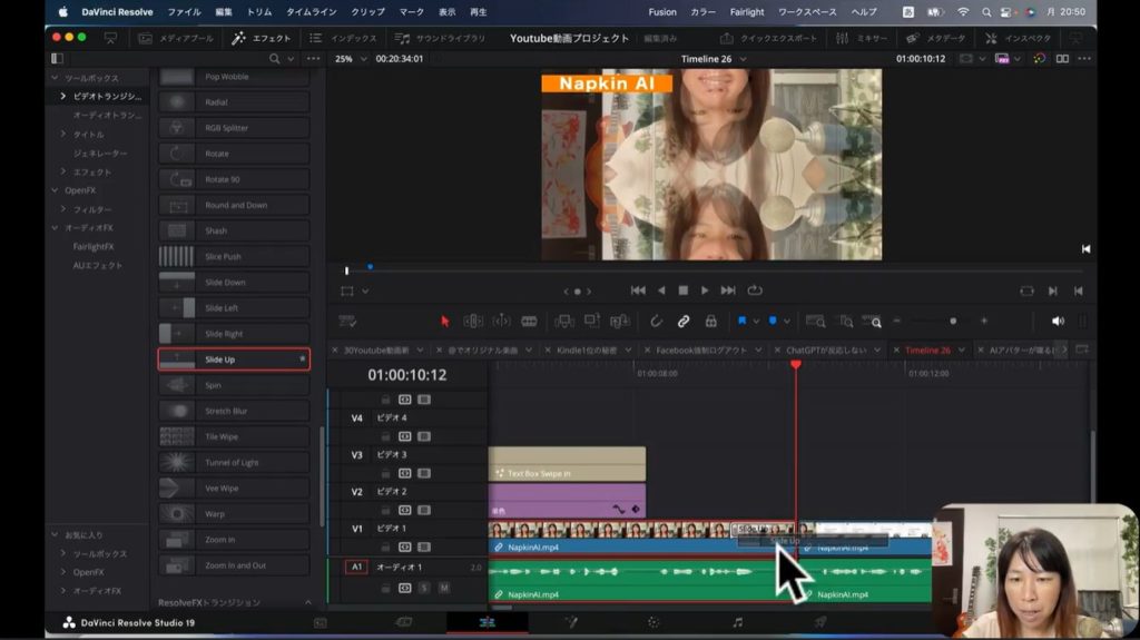 上の画像の「ビデオ1」のタイムラインに注目してください。前後のカットにまたがる形で「Slide Up」で囲まれているでしょう。これでトランジション効果が、前後のカットにまたがる形で追加されているはずです。仕上がりを確認したければ、一度再生してみましょう。