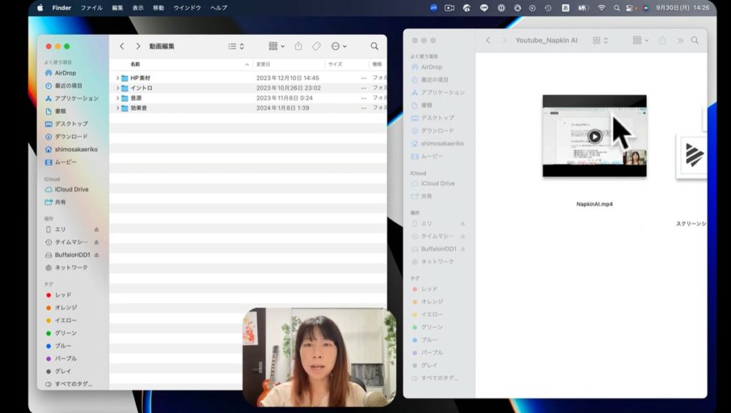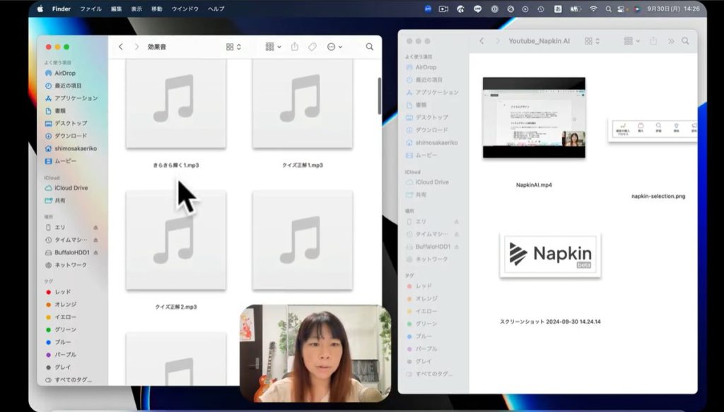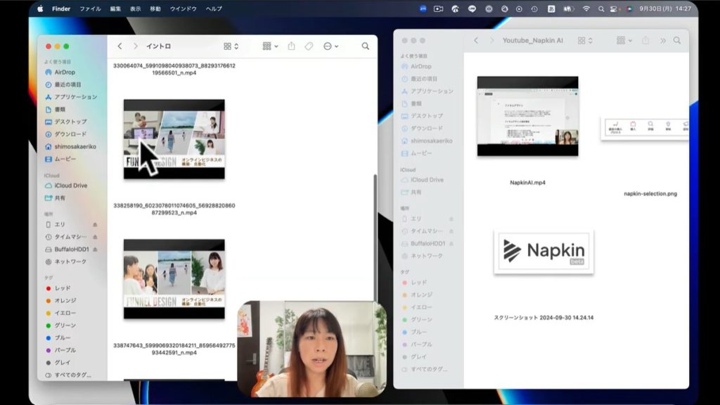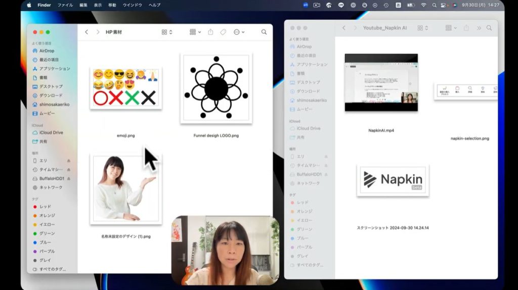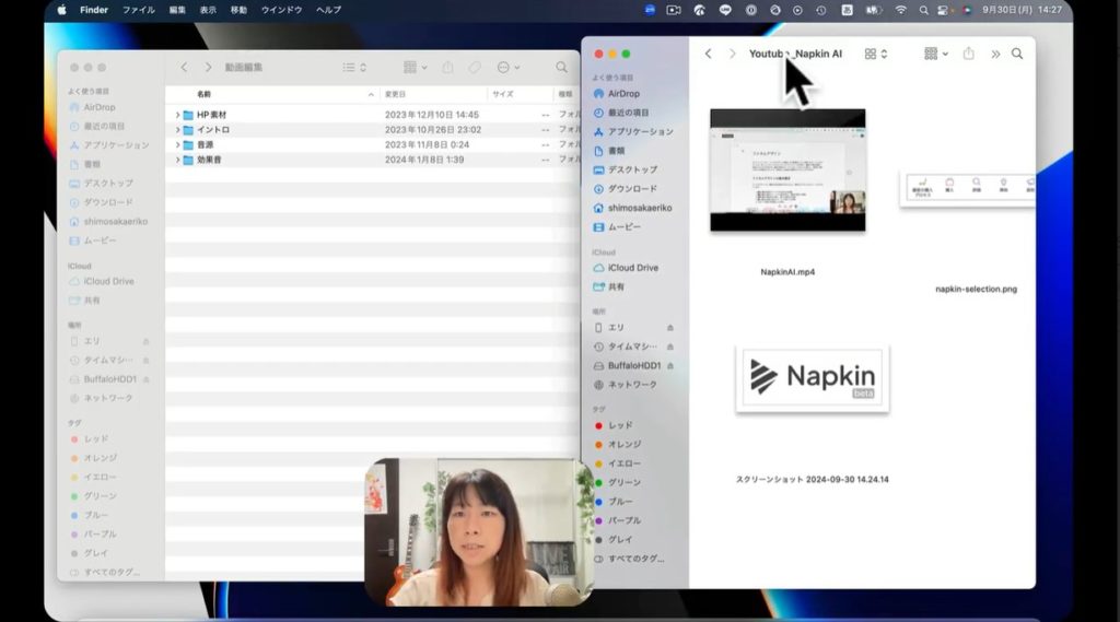 こちらは「Youtube_Napkin AI」という名前のフォルダです。先ほど収録したNapkin AIについて解説したYouTube動画で使用した素材をまとめています。動画の中で使用したいと思ったスクリーンショットなどをこの中に入れるようにしています。