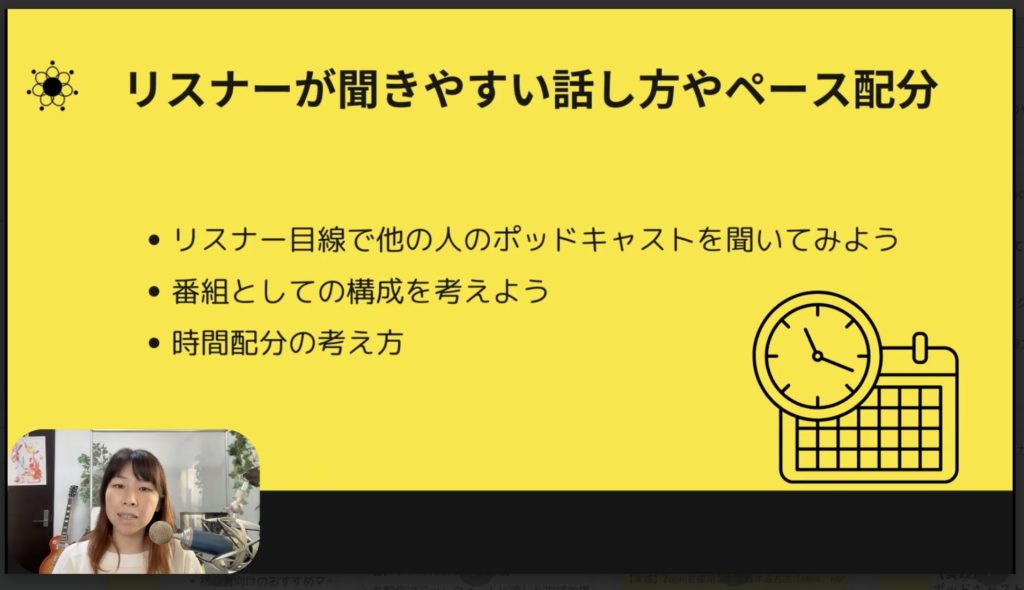 このように、番組のパターンを決めておくと、自分も話しやすく、リスナーさんも流れがつかみやすくなります。配信するたびに構成をゼロから考える必要がなくなり、気持ち的にもぐっと楽になります。また「1回の配信で伝える内容は1つに絞る」というのも重要なポイントです。さっきの具体例を読んでいて、もしかしたらちょっと気づいた方もいるかと思うんですが、結構詰め込みすぎると忙しいんですね。
