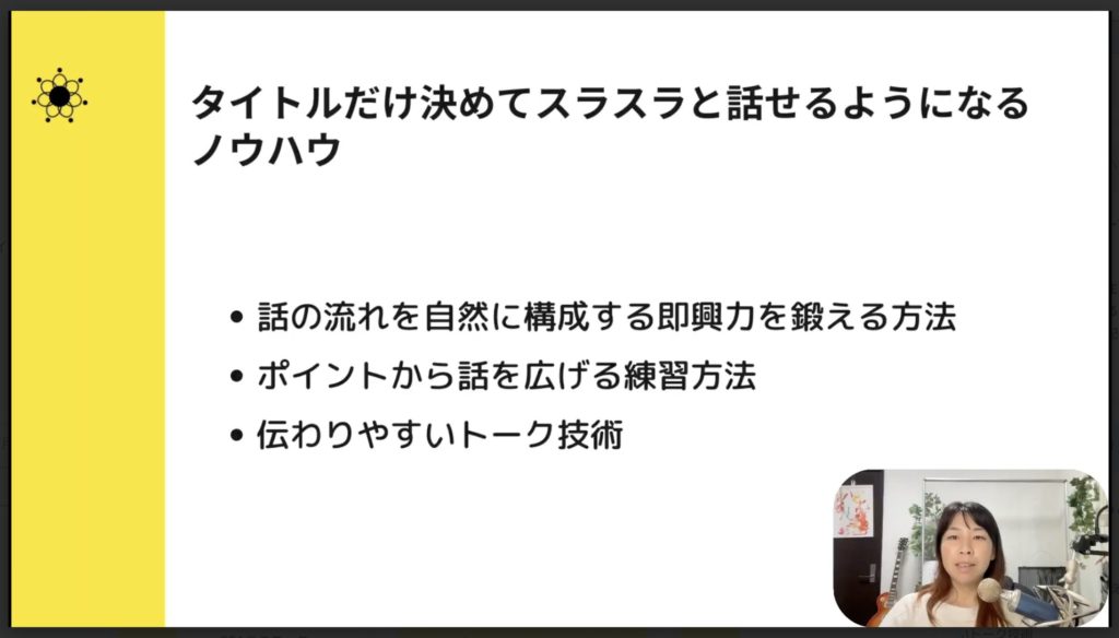 このレッスンでは「タイトルだけ決めてスラスラと話せるようになるノウハウ」について、詳しく解説させていただきます。主に3つのポイントがあります。