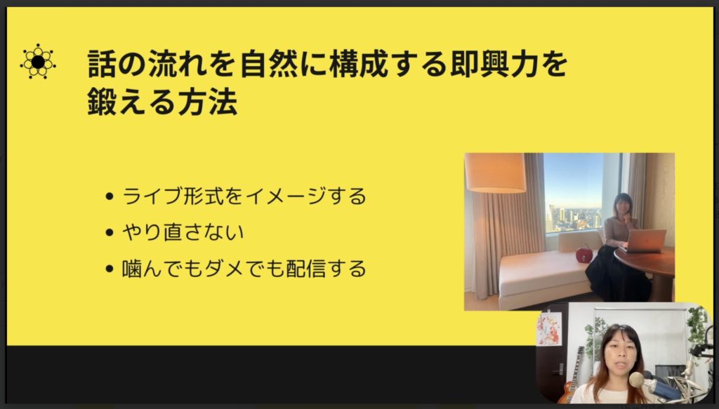 まず最初に「話の流れを自然に構成する即興力を鍛える方法」についてです。「自然に」というところが出てきたんですが「自然に」というのは、まさにライブ形式なんですね。ライブ形式と言われてもピンとこないかもしれませんが、実際に収録ボタンを押していただいて”リアルに誰かが聞いているという前提で話していただく”ということです。