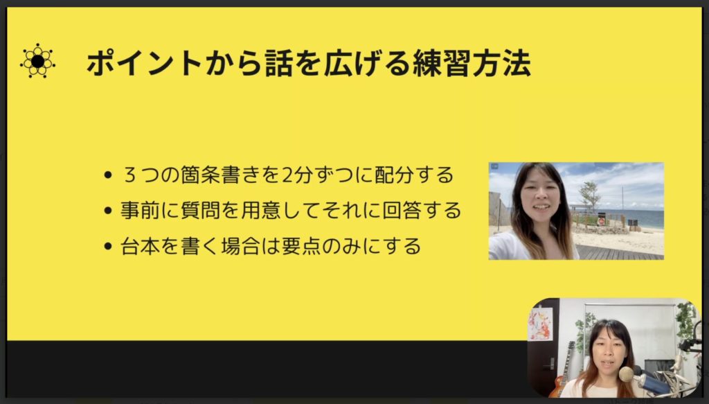 台本を作ることで、時間がかかる上に”自然に話すことができない”ということがわかったので、私は「タイトルだけ」もしくはプラスで「3つの箇条書きだけを見て話す」という技術を習得しました。今回はこのレッスンで、それをどうやっているのかというところを解説させていただきます。