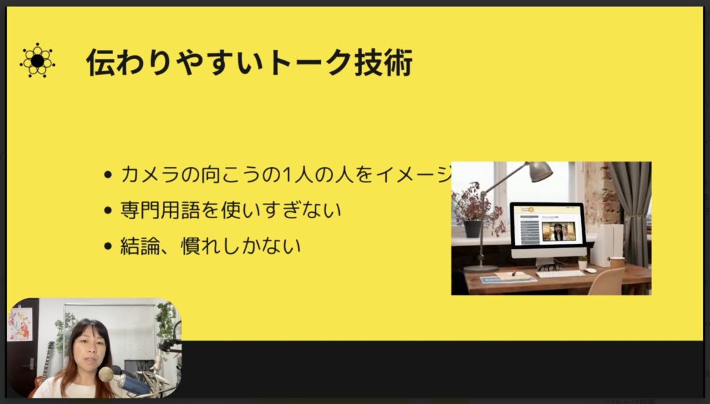 最後に「伝わりやすいトーク技術」についてです。これについては、私はどうしているのかというと、カメラの向こうに誰かいるということをイメージしております。特定の誰かを思い浮かべてもいいですし、私の場合は最初の頃、自分のお客様をイメージして、その人に話しているつもりでやってした。でも今では、イメージしなくてもパソコンに向かって、カメラに向かって、カメラ目線で話せるようにはなりました。ですが、最初の頃はなかなか難しいかと思いますので、相手がいるっていうイメージをしていただくと良いかと思います。
