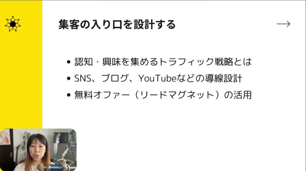 今回は集客の入り口の設計について、お話ししました。オンラインのトラフィックではSNSと広告、オーガニック流入の3つのアプローチが考えられます。どの方法でお客さんの流入を促すか、お金と時間のどちらを重視するか、長期的と短期的のいずれの戦略をとるかで違ってきます。