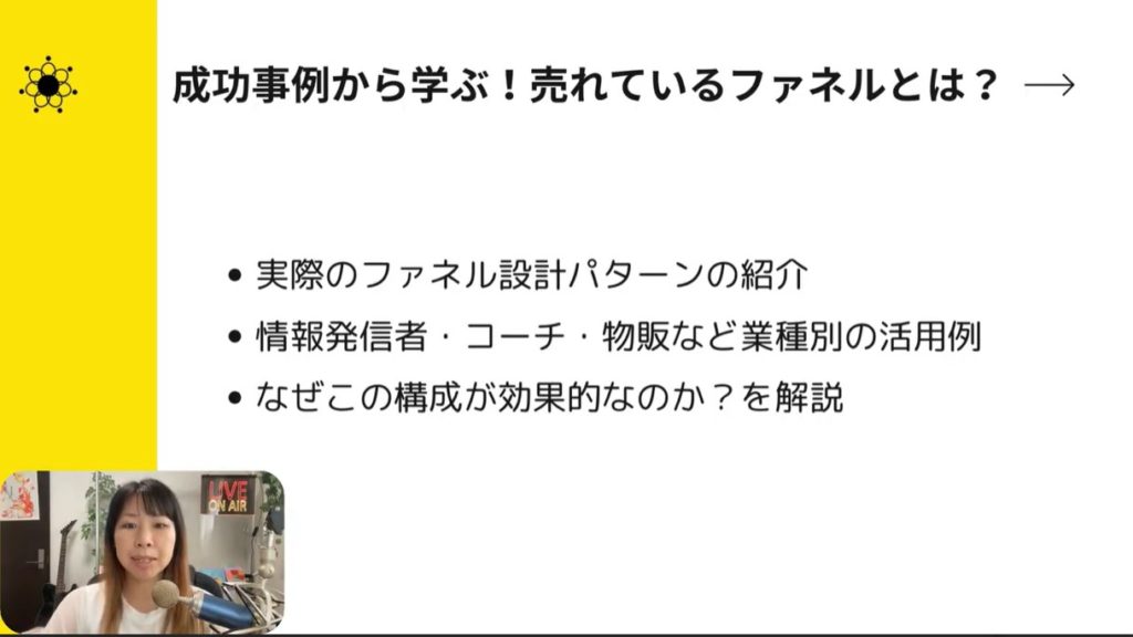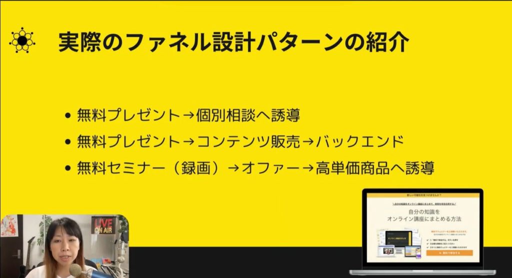 今回は「成功事例から学ぶ、売れているファネルとは?」についてお話ししました。ファネルにはいろいろなパターンがあります。無料プレゼントから個別相談へ、コンテンツ販売を間に挟むこともできます。さらに無料セミナーを配信して、そこから高単価に商品に結び付ける流れも構築できます。