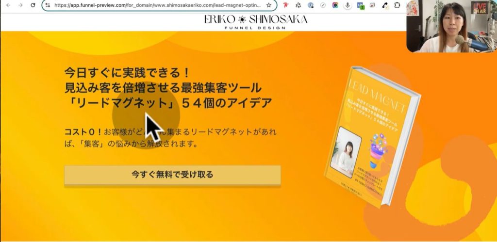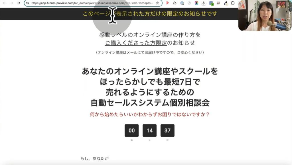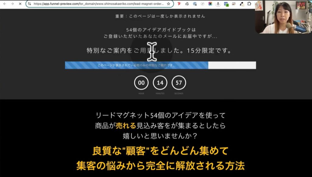 上のスクショはリードマグネットをPDFファイルで受け取った次のページです。このページの特徴は、リードマグネットの作り方に関するオンライン講座を購入するためのオファーサイトで、15分限定になっている点です。