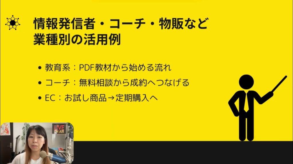 - 情報発信者・コーチ・物販など業種別の活用例